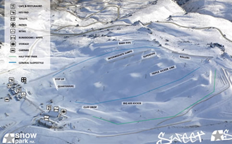 ゲレンデです。BURTONのニュージーランド オープンの開催経験もあり。ゲレンデは比較的すいていて、快適に練習できます。33基の降雪機があり、20M級のキッカーも降雪機で作れるほどの雪を作るので、雪不足の年でも安定した雪の量でパークも充実。 |