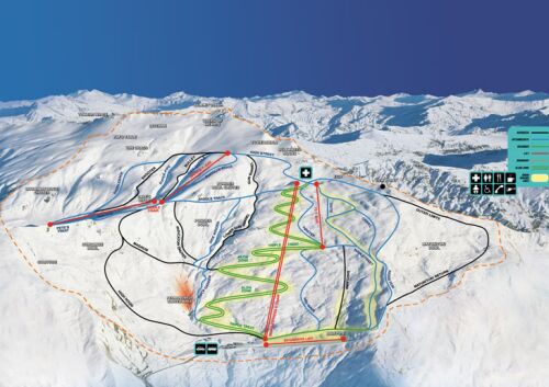 コースは比較的急なバーンが多く、フリーランフリークにはたまらないゲレンデ。降った時の地形や、イージーなバックカントリーアクセスでフリーランがこの近辺では一番楽しく、標高も一番高い為、このあたりでは一番上質の雪が降る。 |